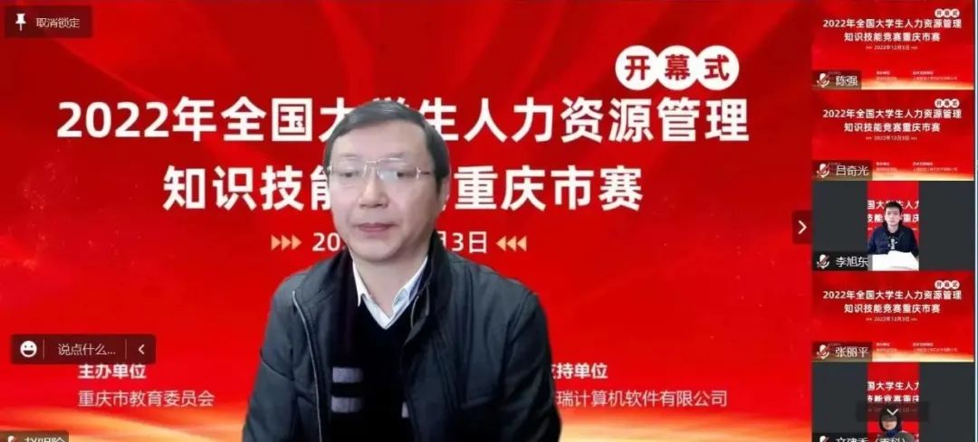 中午12:30,2022年全國大學生人力資源管理知識技能競賽重慶市賽開幕式如約而至,重慶科技學院黨委副書記、校長趙明階、重慶科技學院教務處處長柏偉、重慶科技學工商管理學院黨總支書記李旭東、重慶科技學院商管理學院院長黨總支副書記江燕玲、重慶科技學院商管理學院副院長游靜、上海踏瑞計算機軟件有限公司創始人兼總經理朱營、重慶坊德森科技發展有限公司經理賈雷兵等嘉賓共同出席。