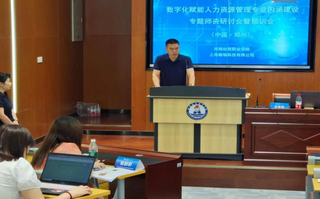 7月26日~28日,由上海踏瑞科技有限公司主辦、河南經貿職業學院承辦的主題為“數字化賦能人力資源管理專業內涵建設”的師資研討會暨培訓會于河南經貿職業學院龍子湖校區順利舉辦。河南經貿職業學院副校長康坤、上海踏瑞科技有限公司總經理朱營、河南經貿職業學院管理學院院長王軍華、河南經貿職業學院商務學院院長王麗麗、廣東工貿職業技術學院工商管理學院副院長倪春麗、南京人力資源產業協會秘書長夏里根、HR數據研究分院院長王斌、易路人力資源科技產品副總裁吳益瑾、益才咨詢高級顧問薛曉峰、上海近嶼智能創始人方小雷等多名行業內專家、學者及企業代表聯袂出席本次研討會議。