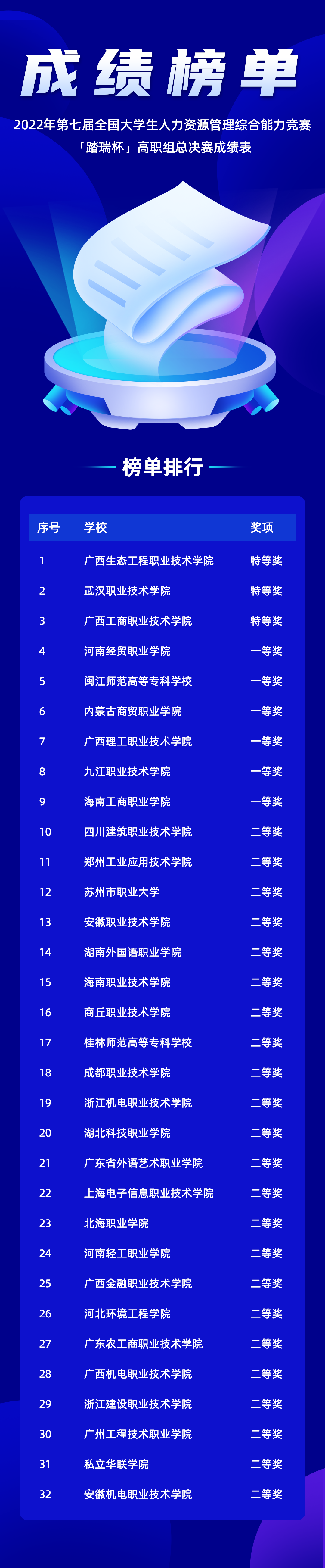 在參賽選手和指導老師的焦急等待中,大賽組委會本著公平、公正、公開的原則,統計并核算比賽成績,獲獎名單如下。至此,2022年第七屆全國大學生人力資源管理綜合能力競賽高職組總決賽(踏瑞杯)圓滿落下帷幕,期待我們來年再聚!