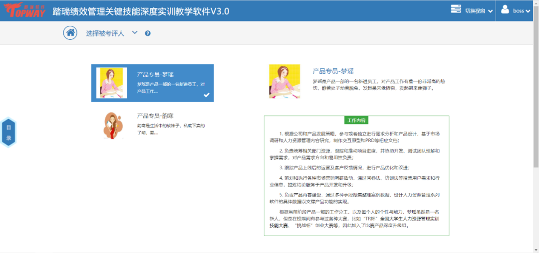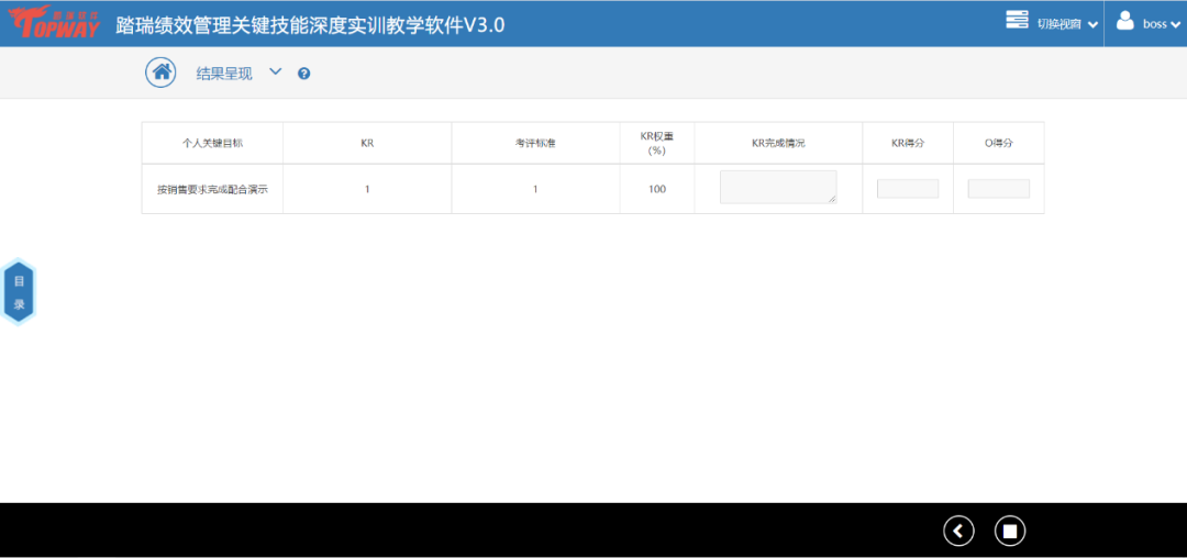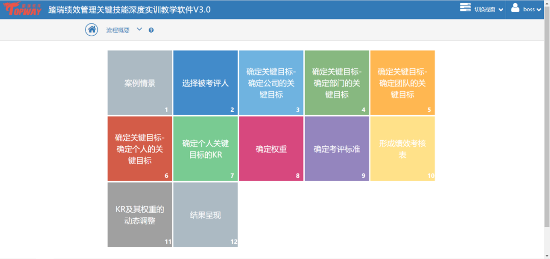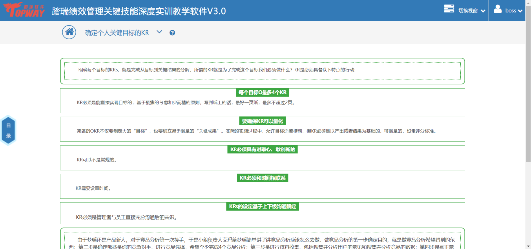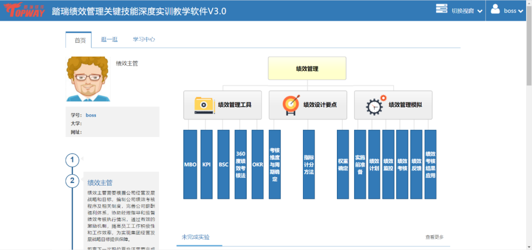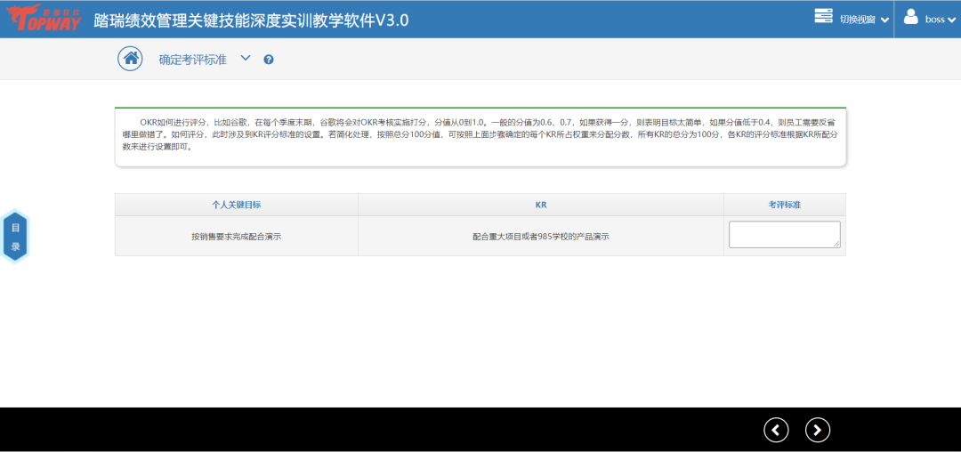 踏瑞績效管理智能反饋比賽軟件是一款緊密結(jié)合理論知識和工作實踐的績效管理課程實訓軟件。通過軟件,學生不僅能夠深度訓練常用的績效管理工具,還可以了解和練習新興的績效管理工具,例如OKR等。此外,學生還可以對績效設計要點進行充分訓練,對績效管理流程進行PDCA全過程綜合模擬。充分地將理論知識與績效管理工作的方法、工具和流程相融合。該軟件能夠充分發(fā)揮學生的主觀能動性,實現(xiàn)理論知識到工作實踐的高度轉(zhuǎn)化,切實達到績效管理課程“會設計”、“會執(zhí)行”的教學目的。