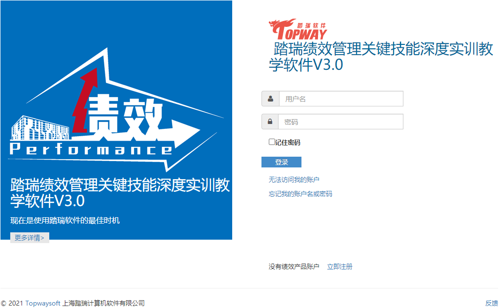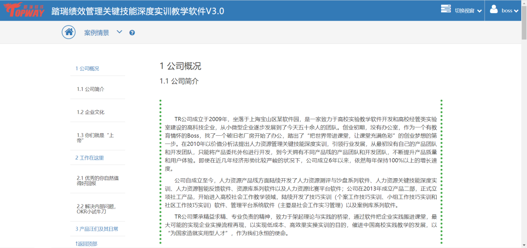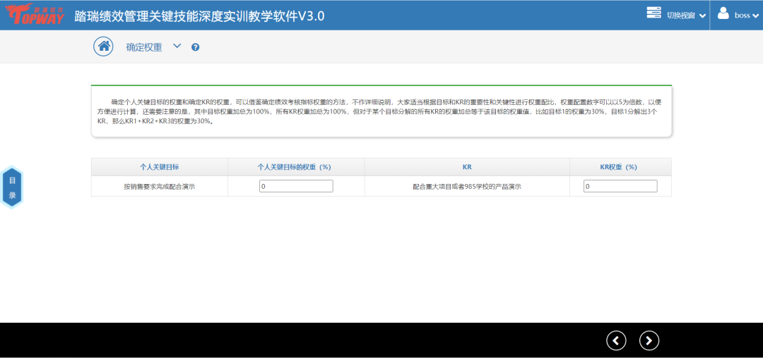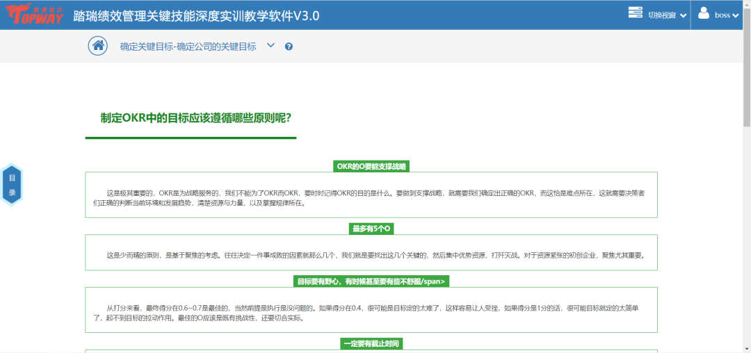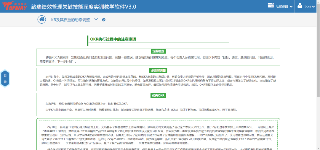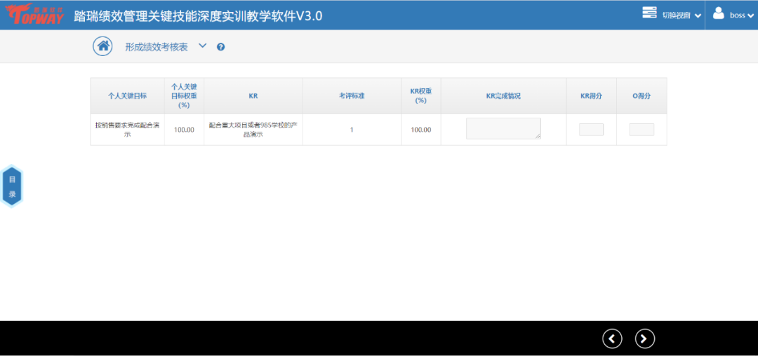 踏瑞績效管理智能反饋比賽軟件是一款緊密結(jié)合理論知識和工作實踐的績效管理課程實訓軟件。通過軟件,學生不僅能夠深度訓練常用的績效管理工具,還可以了解和練習新興的績效管理工具,例如OKR等。此外,學生還可以對績效設計要點進行充分訓練,對績效管理流程進行PDCA全過程綜合模擬。充分地將理論知識與績效管理工作的方法、工具和流程相融合。該軟件能夠充分發(fā)揮學生的主觀能動性,實現(xiàn)理論知識到工作實踐的高度轉(zhuǎn)化,切實達到績效管理課程“會設計”、“會執(zhí)行”的教學目的。